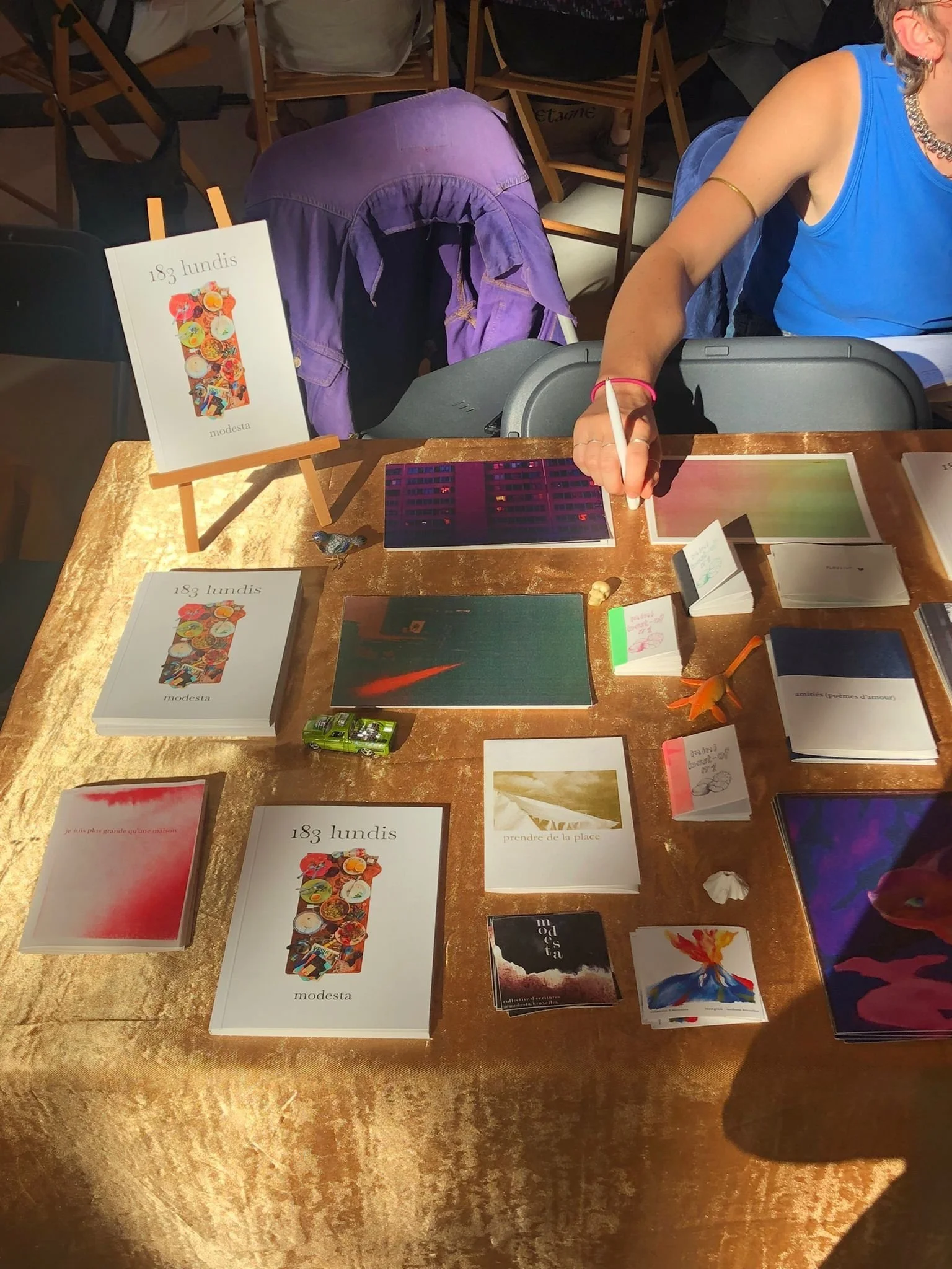 évènements 𓆤 évènements 𓆤 évènements 𓆤 sept. 19 à 21 sept. Poetik Bazar ven. 19 sept. 2025 10:00 dim. 21 sept. 2025 06:00 Halles de Schaerbeek (carte) Google Agenda ICS Marché de la poésie. Une table de fanzines et un atelier. Voir l'événement → mai 10 évènements passés Les 4 ans de modesta samedi 10 mai 2025 03:30 07:00 Google Agenda ICS Joyeux anniversaire modesta. Voir l'événement → déc. 16 Atelier et micro-ouvert à la maison poème lundi 16 décembre 2024 18:00 19:00 Google Agenda ICS Atelier et micro-ouvert tombola. Voir l'événement →